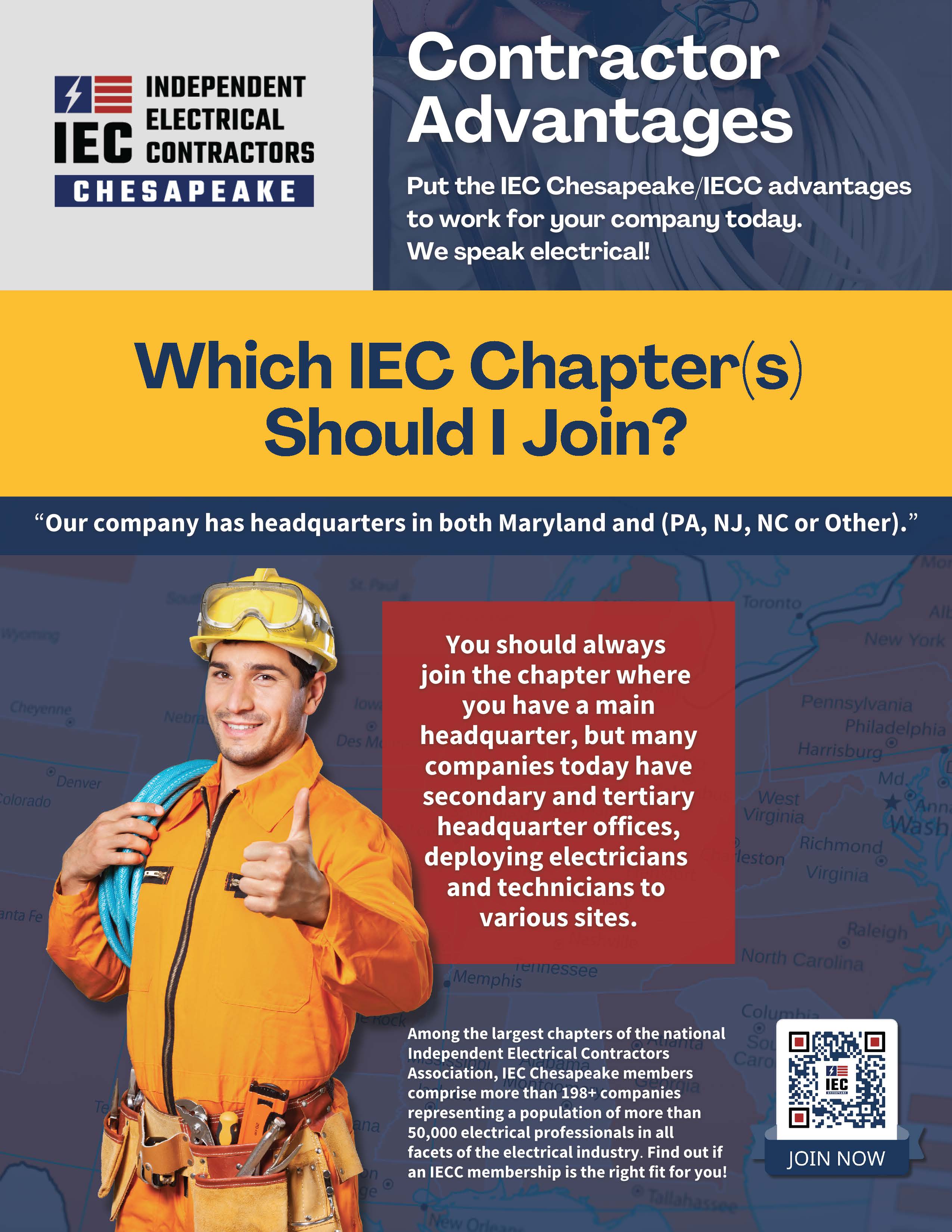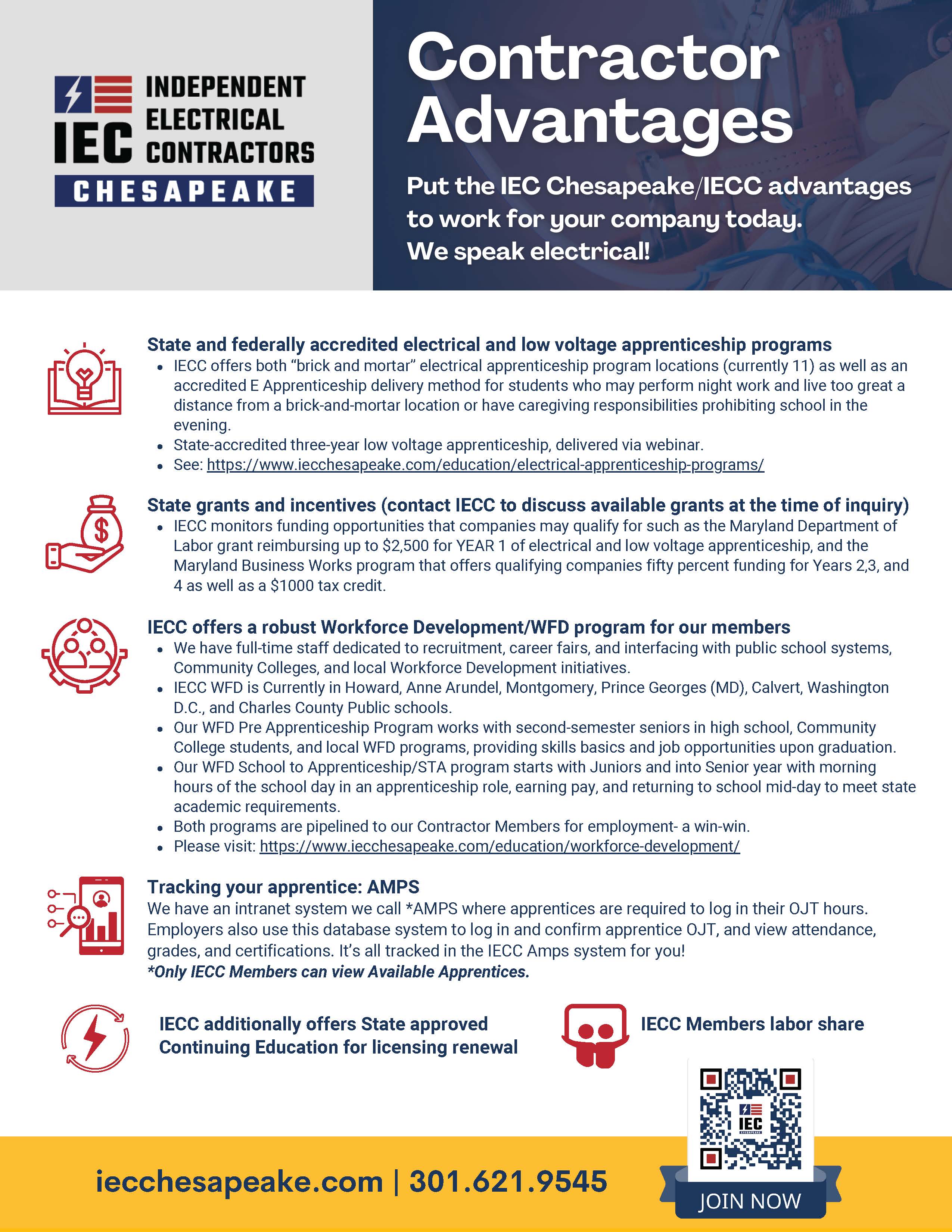 One of the largest chapters of the Independent Electrical Contractors Association (IEC), IEC Chesapeake (IECC) includes over 200 contractors and industry partners representing over 50,000 men and women in all facets of the electrical and HVAC industries. Our strong infrastructure and our relationships with other organizations and community colleges allow us to provide advanced, Hands-On education and additional resources to members. Our Online ( E Apprenticeship) program has included students as far away as Germany. While it is impossible to include all of the benefits our contractor members receive, we encourage you to take a look at just some of the reasons the IECC family continues to grow.